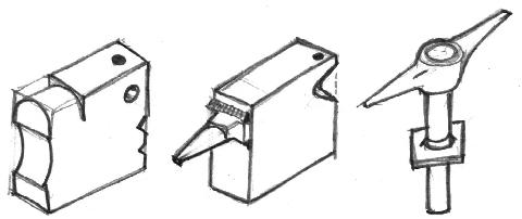 - Center, A slender horn made from half of an old pick-axe, the eye flattened into a flange for welding. Preheat both block and "horn" before welding.
