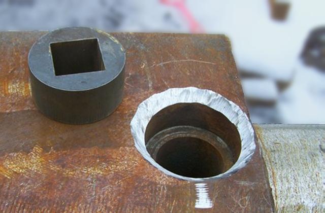 Holes preped for welding in the waterjet cut square hardie hole inserts.