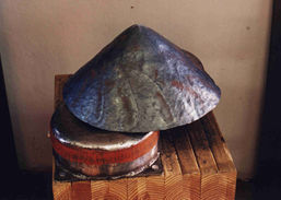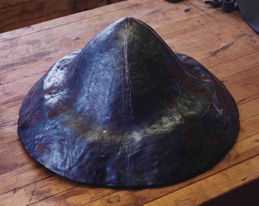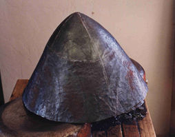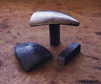| At top in the picture above is the stake I made for this helmet; bottom, are pieces for another stake of similar style that I will finish later. These stakes are very cheap and easy to make. Get a quantity of scrap 1/2" thick truck spring stock from a spring repair/refit shop. They usually have piles of the stuff. Flame cut out wedge, heater, and disk-shaped pieces, depending on the shape of the work you want to fit. Heat them up in a forge, pound them into rough curves in a dishing block. Grind surfaces to final shape. Weld on shanks of 1" mild steel square bar, or whatever shank size you have a holder for. I never heat treat these stakes; the 5160-type alloys used in vehicle springs is very hard and tough, even after cooling in still air. | |