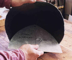 | I just stick the templates into the helmet bowl (you can see here that the helmet is definitely an oval at the rim, now), and make a mark where they cease to touch the sides, with a marking pen. I do this for both fore/aft and side/side, making four marks around the bowl. I then transfer the marks to the outside, using welder's chalk, connect them in a rough ring, and this shows me where to begin the next course. |