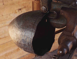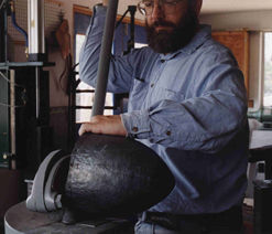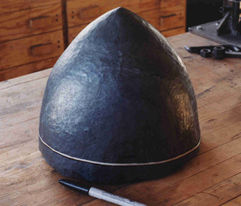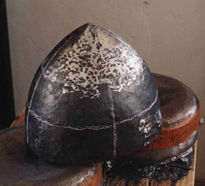 | The last rough raising being done, it's time to bouge the helmet to smooth it out for surface grinding. First, though, I have to trim the edge to make it fairly level and even. A ragged edge makes it very hard to judge the symmetry of a helmet by eye. I use the "rubber band" method: it is admittedly not period, but it is quick! |