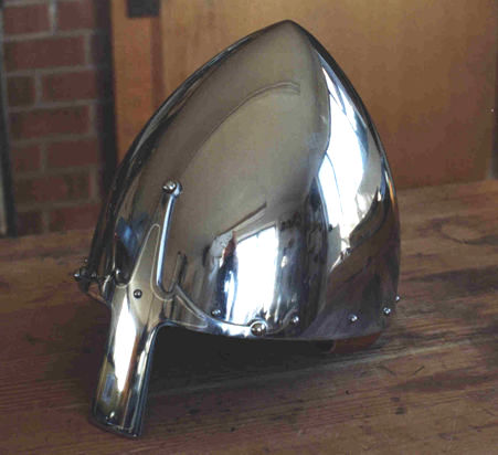 | And here it is, a Norman helm with decorated nasal. Final weight: 4 lbs 14 oz. | |