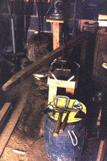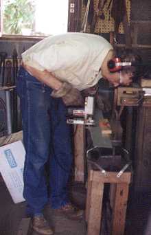 18) Rounding off the last rivet with the concave section of the rivet set. Note that the "field expedient" stake is clamped in the vice, it’s bottom L sitting on the floor. It was switched back and forth between the anvil and vice as needed. Over 66 rivets were used in the helm. |