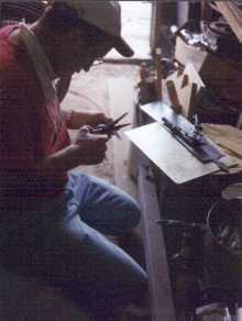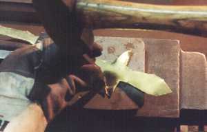 16) The gore is clamped on and the center hole is drilled to rivet the base to the brow band. Position is critical. If something slips, don’t fudge it; go back and make sure it’s right. |