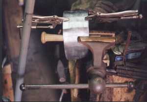 | 15) The gores: Each gore had to be measured and fitted individually. A pattern was made using aluminum foil (able to hold a semblance of a three-dimensional shape) and carefully marked (right front, left front, left rear, right rear, left rear, inside, outside…) as to the position when wearing it. (If you mark it as if you’re looking at it, you’ll get switched up when you turn it from front to back, so your “left rear” ends up on the same side as your “right front”! Trust me!) After working out the gores I added ¼” all around to the pattern. This was a little close, and next time I’ll give it at least 3/8”. Shown in the picture is the foil pattern, a cut out blank, the finished gore, riveting and ball peen hammers, and a really useful deep C-clamp. The 60# “field expedient” stake is shown held down to the anvil. Just beyond it are several stumps and the "cannon ball" stake used inside the bands and gores for edge rounding and planishing out the deeper ball peen dings. | ![]() |