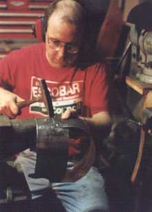 14) Working at the stump on the sidepieces that will run from the crest band to the brow band. These pieces have to curve two ways at once. Cross strokes with the convex planishing hammer will curl it upwards. Hits down the length will curl it from side to side. There is a small dishing hollow in the stump, about 1” across, and this was alternated, as needed, with the more level part of the stump to form the compound curve. Note the heavy leather gloves, to protect the hands from vibration as much as from sharp edges. Once these were riveted on I used the "cannon ball" stake to round the edges a bit more inward for the gores. |