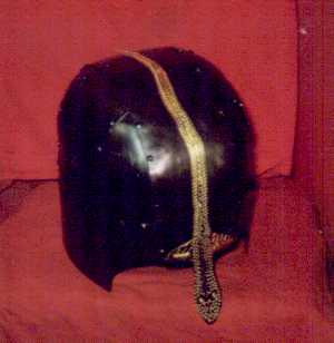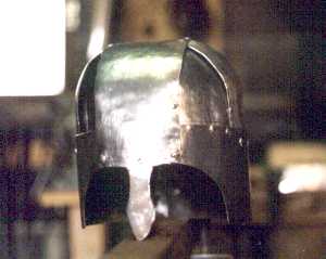 | 11) The basic frame, brow band and ridge band, finished. Now is the time to check the fit and clearances, remembering that a padded hood or a snood cap and mail will have to fit between the helm and the head. | ![]() |