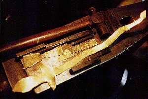 | 13) After trying various shears on the irregular lines of the heavy gauge brass, it was found that a hammer and cold chisel were faster. The aluminum backing plate came from a scrapped steam iron, and has proved remarkably durable. | ![]() |