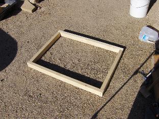 Starting the foundation. The city regulations require us to make this a non-permanent structure; it has to be capable of disassembly and "no-trace" removal within a day. No concrete footer or excavation of any kind is permissible. But we need a bottom treatment of some sort, because the Presidio courtyard (hard-packed soil and gravel) is nowhere close to level. We'll just make a mud pad. I pre-made a simple rectangular form of scrap 2x3 lumber, a couple of inches bigger than the forge footprint, to make laying the pad easier.