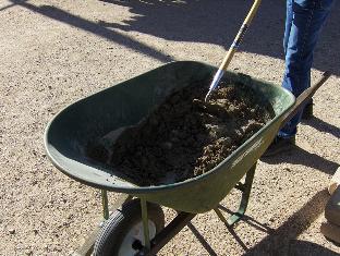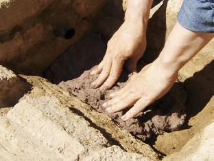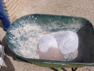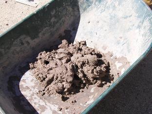 Weekend #3 (8/7/10). Today we clay the hearth. I estimate that about 8 liters of clay mix will do the job, so I start by dumping 4 liters each of screened Vail clay and coarse grog (the white stuff) into my wheelbarrow. I mix the ingredients dry, then mix water in by hand. Clay mixes are very sticky, and a hoe does not work very well for wet mixing. After a few minutes of kneading, we have a nice, heavy-bodied mixture. I make it fairly stiff, with almost no moisture shine.