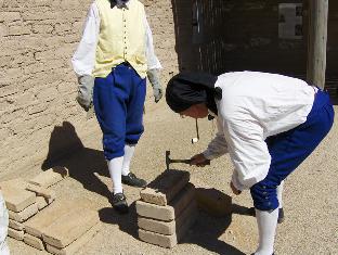 Mid-way through course #7. Note the increased area of shade; the Presidio unit has rigged an awning, using some canvas, ropes, and a couple of lances. It's a blessed relief. It's now about noon, and the temperature is approaching 100 degrees. The 50-60% humidity (July is in our rainy season) is actually a help; it makes us pretty miserable, but keeps the mortar from drying too fast.
