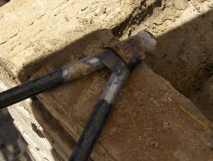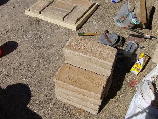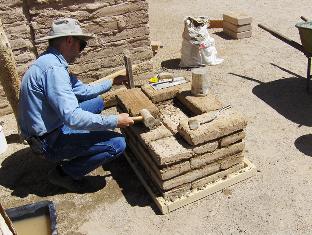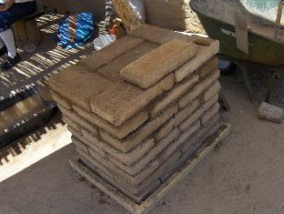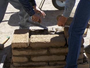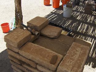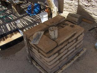 We let the foundation course dry in the morning sun for about half an hour while doing some material prep. Our puddled adobe bricks have slightly raised edges and corners on the top side, and I want them smoothed to make laying the courses easier. Some of the soldados pitch in to knock off the edges of several dozen bricks with a mason's hammer. Prepped bricks are stacked for laying up.