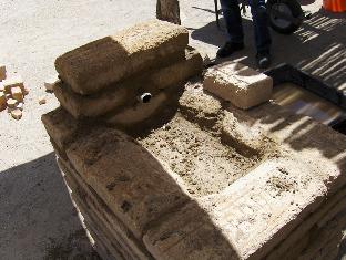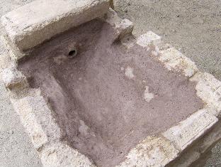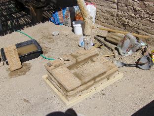 The forge is essentially completed. Next step is to fire it up, after the clay dries for a few days. Bill will bring his concertina bellows next weekend, and some coal, and we'll try it out. In place of the truly ugly plastic tarp we were using, I just placed some pine boards and bricks over the wet hearth; this makeshift cover doesn't look too out of place in the Presidio courtyard. We will build a nicer forge cover in time for the tourist season.