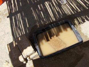 Dry ingredients for a batch of our mortar mix: 6 liters of adobe soil, 6 liters of sand, and 1.5 liters of mortar cement. This makes a 4:4:1 mixture that John Acton recommended for adobe mortar. (What you don't see here: I decided to modify the foundation pad mix by substituting 2 liters of gravel for 2 liters of adobe, tossed in after the photo. I thought this aggregate would strengthen the mortar a bit, making a more stable foundation. Time will tell.) We add water, start stirring. We are making the pad mortar pretty stiff, with the barest glisten of moisture when squeezed in the hand.
