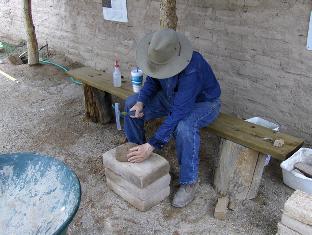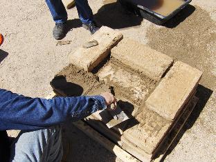 Typical bricklaying sequence: We start by dipping each brick in a water tub for a few seconds, pull it out and stand it on end to drain. (I hear the collective gasp. But it doesn't hurt cement-stablized adobe, and having the outer few millimeters of each brick damp really extends the working time on mortar joints. Out here in Arizona, the bricks get absolutely parched, and will suck the moisture right out of freshly-laid mortar.)