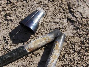 A close look at the tuyere, before it is buried in the forge body. I used 3/4" black pipe. The design is drop-dead simple: hacksaw off a section of one end of each pipe, so they meet at an angle, forming an oval mouth. Guess by eye, and grind a bit after sawing, so the pipes meet well at about a 40-degree angle. Tack the pipes together with a very short weld on either side. Weld on a piece of strap on one side to strengthen the joint, if deemed necessary. Then cut and roll a cone out of 12 gauge steel so that, when flattened a bit, the cone comfortably shrouds the joint.