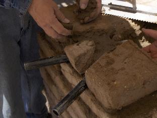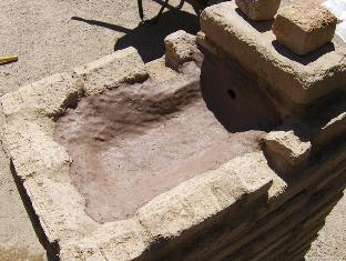 With a spray bottle, we dampen the adobe pan, figuring just a touch of moisture will help the clay adhere a bit better.