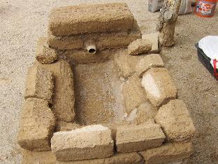End of build for the day. Two views of the forge body. There still remains some adobe work to do: a rim of brick fragments to continue the slope of the hearth cavity up three more inches. One prospective chunk of the rim is resting on the forge in the photo. I want to give the hearth a bit more depth than just one thickness of brick. But finishing the forge will have to wait for next weekend.