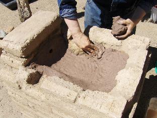 In goes the clay! We lay down a thick (about 1.5") bed on the hearth bottom.