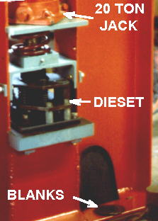 The dieset does not use a pressure pad being designed with only 1/8" clearance. It does have a "stripper" plate. The stripper springs are from an old auto clutch. The parts of the dieset were cut with a cutting torch or forged. The plates were stacked up and match drilled and taped on a small hand crank blacksmiths drill. The guide pins are 1" dowel pins welded into torched holes! Guide bushings are babbitt in welded pipe housings.