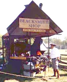 Demonstrating at Bethbara park during the Celtic Fest, Jim Wilson at the Bellows, Joe Rotenberry forging and I'm in the tent in the background taking a break. From left to right, Joe Rotenberry, Jim Wilson, myself and Jim Lewis in the Kilt. May 2002. Photos by Sheri Wilson.