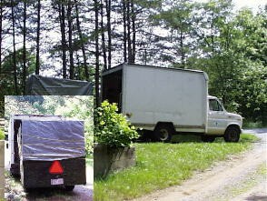 The photo at left is of the trailer leaving home. . . The tarp on the top is to keep pieces from blowing off.