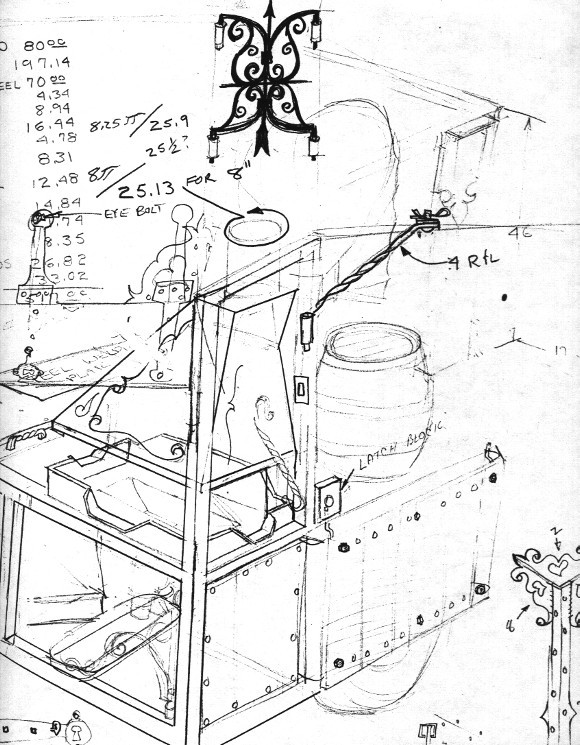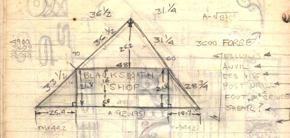 The sketch below is of the forge corner. The forge was laid out and built in the trailer from this sketch.