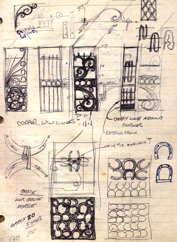 The sketches below were for grills to cover portions of the trailer. The tall "gate" became a ladder with alternate openings similar to the middle drawing. The horseshoe grill was made later by Jim Wilson.