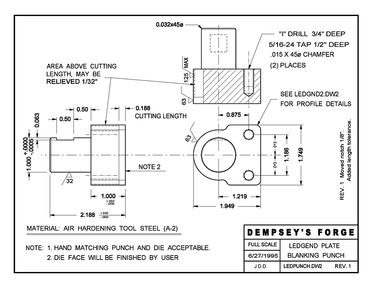 The detail part drawing to the left is an "in-house" drawing for a one-off project. It is missing center marks and a cross section axis line. The view locations are also not standard. However, it has all the basics, border, title block, notes, dimensions with tolerances. Click image for an enlarged detail.