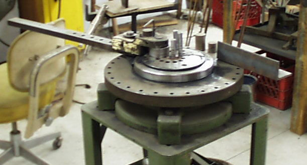 The scroll bender on the left is cast iron but there are similar benders made of flame cut steel that is bent (pulled out) after torching a spiral cut.