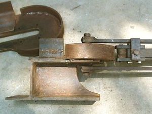 This is a custom made bender I built to make several sizes of large U-bolt. It has two interchangable dies and an adjustable bending arm.A pre-threaded bar with a nut on the starting end is positioned against the inside vertical surface of the angle iron bracket. The poistioning of the nut assured that the legs of the U-bolt came out exactly the same length. In this case that was when the nut was flush to the end of the rod.