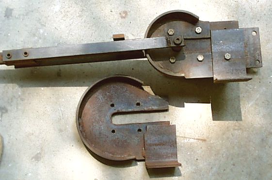 To constuct the bender guide surface the bending arm should be used to assure a smooth fit. I prebend the flatbar, weld the starting end, adjust the bending arm against the flat and then work around the arc with handle tack welding the part in place. This assures a smooth radius with the center pin exactly centered.