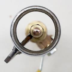 This burner uses a piece of lamp pipe to create an adjustable burner where the depth of the injection orifice can be moved and an air damper used. The downside of this design is that lamp tube is straight pipe thread and the fittings will leak unless heavily doped with a filled hardening pipe dope (not one of the new annaerobic types). Note that nuts to fit lamp tube are also fairly expensive and the design requires four.The bracket center is a piece of solid bar (round, hex or square) drilled length wise for the lamp pipe to pass through. It is welded to the burner the same as the design above. The damper disk is cut from any convienient piece of sheet metal. I used a couple of candle drip pans I had on hand. The dished pans made a nice flow consistant shape. All fittings are 1/8" pipe as in the first design.