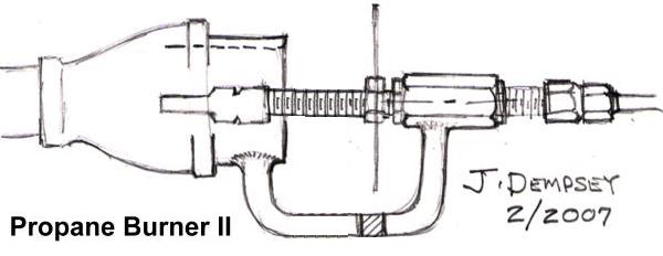 This burner has no air adjustment and in the welded configuration above no nozzel depth adjustment. However, I have built a number of these burners and they have worked every time. They are the right size to fire a freon can melter or forge as shown below.