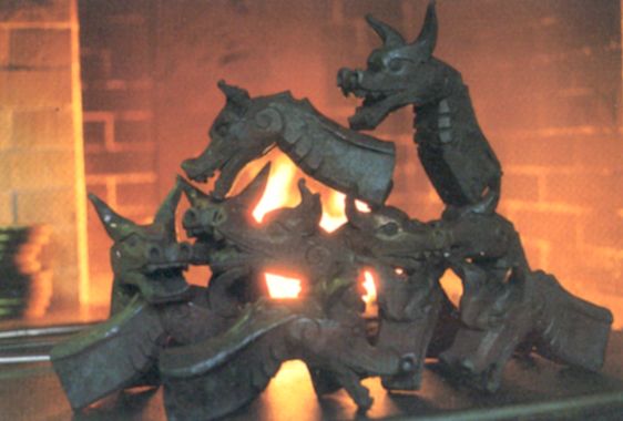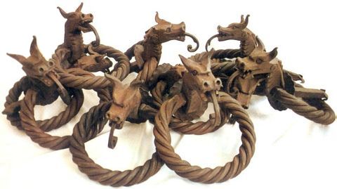 Completed pieces with aged finish. Many new smiths struggle with projects such as those on our anvilfire iForge page that seem to look simple. And when you actually watch a master smith making these pieces they indeed DO seem easy. But the reality is much different. "Simple" opperations like chiseling an ear do not go as planned and the metal cools too fast to punch both eyes in one heat. For the begining smith the frustration level can be very high. The practice gained by producing quantities of an item as shown here are what gives the master smith that easy of working with hot steel. This practice gives them the confidence and ability to work fast and do more per heat. When you watch them is seems the steel stays hot for a very long time, but when YOU try it the steel cools instantly. But the steel cools just as fast for the master as for the apprentice. RETURN TO REVIEW of The Italian Masters of Wrought Iron ALINEA editrice Firenze, Italy Distributed in North America by: ArtisanIdeas.com