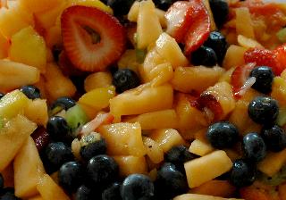 Fruit mix with cantaloupe, kiwi, peaches, strawberries, blue berries and goji berries.