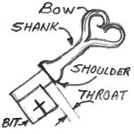 The parts of a key are the bow (handle), shank, shoulder, throat and bit. The shoulder is optional depending on the type of key. Most barrel keys do not need a shoulder but may have one for decorative purposes. Modern bit keys that work from both sides of a lock need a shoulder to position the bit in the lock.