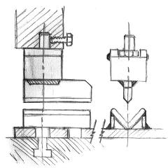 The V-block is made from angle iron welded to a plate. The upper die is made from a 3/4" hex head bolt, a block of steel and a piece of 1/4" or 3/8" flat bar.