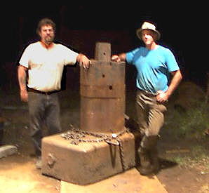 Bruce Wallace with Josh Greenwood next to 12,000 pound anvil for a 750 pound air hammer! Anvil is from a 750 Chambersburg self contained hammer and will be installed in a 750 Niles-Bement. |