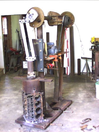 Yes, it runs, and only on 3/4 HP! Yes, it has some minor problems, but nothing we can't fix or get around by the method of operation. Would you believe the shocks work too well? The shocks lift the weight just fine and the hammer hits just fine but at full speed the ram stays up (off the work). This means the dual shocks are too stiff. Don't have time remove one and retest so it will be run as is! Brake/clutch works great! Has very gentle touch but engages positively when wanted. We were worried that it would hang up and not release. As a heavy duty automotive mechanisim designed for millions of cycles under much higher load this part of the JYH should give long dependable service. As shown the treadle is yet to be installed and the clutch was being operated by a pair of vise grips. The motor and bracket is being held on with c-clamps. A brace between the anvil base and the first column needs to be made as the column rocks back and forth almost an inch! I knew this needed to be done but needed to get the tests underway. (Tom, remember I told you that steel column was going to be too flexible!) Forging with the East Coast JYH! p.6 |