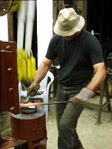 Josh Greenwood showing what the EC-JYH can do! Forging, Incising and cutting. Josh had seen drawings of the EC-JYH but when he first saw it he laughed and said, "It REALLY IS made of junk!" After running it and forging some samples he said, "NOT a bad hammer! It's NOT an AIR hammer, but it is very controllable for a mechanical hammer." |