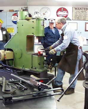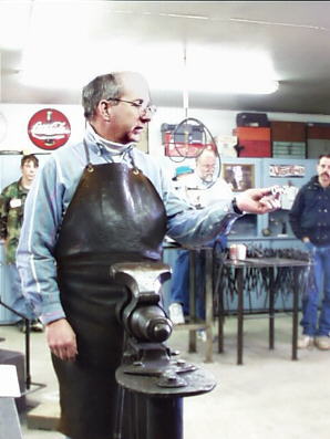 Nick produces forged hardware in quantity. He demonstrated several techniques including a number of special dies for use in the power hammer. He also tried to demonstrate the use of a Donald Streeter type hinge bender which he had given up on and instead had a local machine shop press brake his hinge loops. It never hurts to look for someone that can do a job cheaper and faster than you can! |