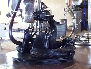 Eternal Struggle is the title of this piece. Ward say's the dimples in the dragon each took three strokes using a three pound hammer! This work is roughed out hot, then carved with chisles and finished with files and abrasives. The dragon is mild steel while the sword and other parts are stainless steel. The dragon is finished by a rust browning method. | |||