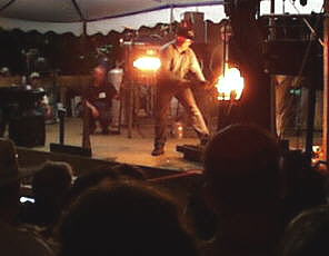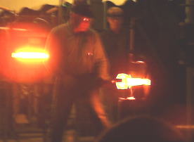 Night Forging Demo at Forging Station #1 Art Jones forging a 60 pound billet under a 300# Chambersburg utility (air) hammer. My appologies to Art! I had previously indicated it was Toby Hickman doing the demo. Toby was the station captain at the heavy forging station and assisted Art. Art, if you see this, I owe you one! |