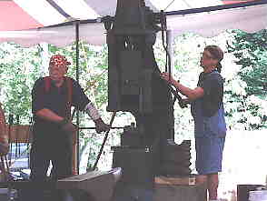 Tony Reece, of Ahtens GA , tightening or adjusting the dies on the Chambersburg 300#, and the back of Bill Price of Memphis, TN, Were part of the power hammer crew that provided support to the demomstrators. The other members of the crew were David Ponsler, Jacksonville FL and Toby Hickman, Sebastapol, CA.