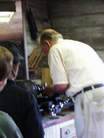 | Harry (Hap) Fisher of Windsor Forge, demonstrated metal spinning. Hap describes himself as an artificer (decorative metal worker). He spins pewter for making reproduction colonial items and also does hammered metal work. Above left, Hap is showing an edge trimming tool made from a piece of hacksaw blade. The lathe in use was an 8" Atlas lathe. Atlas also made the small Craftsman lathes popular in the 50's and 60's. | ||||