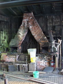 This pre Civil War shop is located in a downtown neighborhood. Originally a livery and farriers shop the Rileys now do small industrial forging. Double blowers feed air to the forge. Electric and manual blowers are connected to the same pipe. The hand crank blower would give that fine control necessary for doing fine work. I didn't have the presence of mind to look for a blower on the right hand side of the forge. Sorry about the bad focus. My Olympus digital camera will take beautiful photographs in low light but the stupid automatic focus won't work in the same light! |