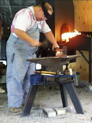I had seen this little tool years ago and hadn't thought about it since. Used for marking (blocking out stock) and fullering, several of the demonstrators used this tool. It is anchored into the hardy hole and also acts like an extra set of hands. Bill Epps had a slightly larger one that he had filed two arced and rounded places in the blades. He used these places for smoothly fullering a groove or neck in round stock and for sculpting small pieces that were hard to get other tools into. Last month we saw Jim Miklos from American Homestead at the PABA meet doing a similar thing using the reins of his tongs. | |||