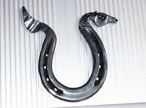 Horse sculpture from a horse shoe. Bill didn't like this one so after the demonstration he made a couple more for the auction. Bill says he used to make these from the shoes he took off horses and make extra money while shoeing. This says a lot about why Bill got out of the farrier business. He wanted to do more than make shoes! | |||