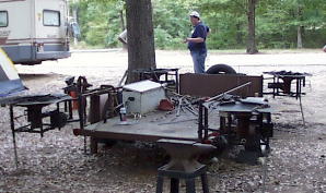 Montgomery Alabama Group Forge The Montgomery group provided their trailer mounted multi forge setup for a teaching station and for the nail making contest. The four identical forges swing out and have an extendable leg for support. The forge includes a small anvil and stand for each station. |